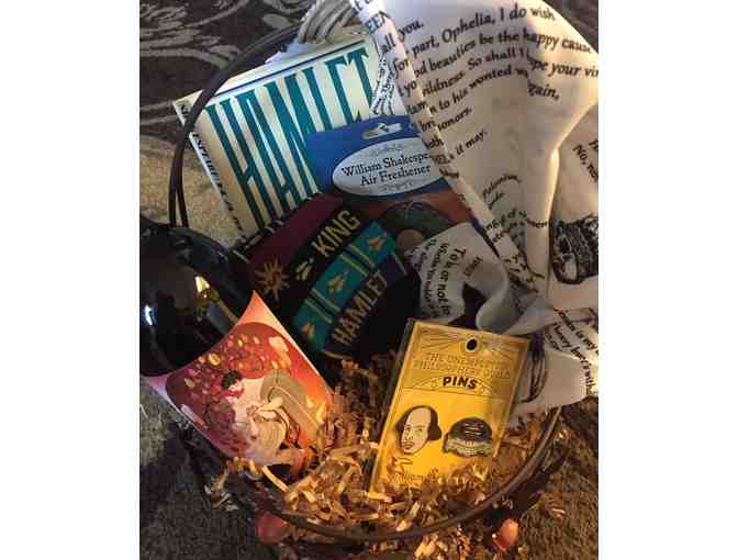 "God has given you one face and you make yourselves another": gift basket includes Hamlet circle scarf, Prophecy Lovers red blend, Shakespeare enamel pins, "Taming of the Shoe" women's Shakespeare knee socks, Shakespeare deluxe air freshener, Barnes & Noble annotated Hamlet.