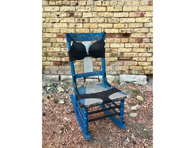 My rare chair has been in my family for years. I nursed and rocked my son, Michael and daughter, Nicole in this chair. I thought “Rock Me Baby” would be perfect for my chair’s theme. Turns out, “Rock Me Baby” is not about rocking an infant. It’s about a relationship between a man and a woman, which explains the additions to my chair. “Rock Me Baby” is a blues standard based on Big Bill Broonzy’s 1940 song, “Rockin’ Chair Blues.” B.B.King’s and Muddy Water’s renditions are credited for making it well known.