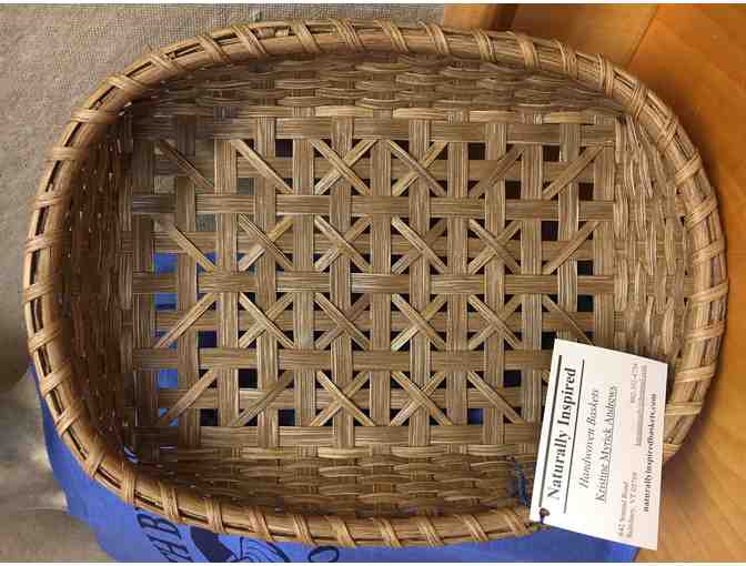 Offered here is this finely-crafted handwoven rattan tray by Vermont Weaver Kristine Myrick Andrews. The top measures 12 x 16, the base 9.5 x 13.5. and it is 3.5 inches high.