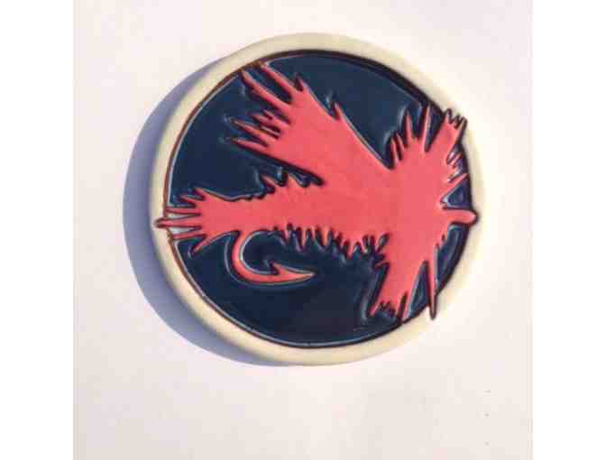 These 4" coasters are made by Aloe Tile Works, a ceramic art tile studio in Corpus Christi, Texas. The coasters are individually hand-made with a slip-painted, mid-range, custom-blended stoneware. They are dishwasher and microwave safe. Don’t drop them on a stone or tile floor or hit them with a hammer because then they will break and you will be sad.
