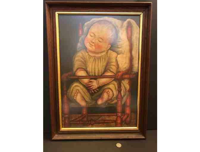 Probably paint on panel, no artist name is visible on this framed portrait of a baby peacefully sitting in a cozy chair. Large frame measures approx 18x28.. Further research may provide insight!