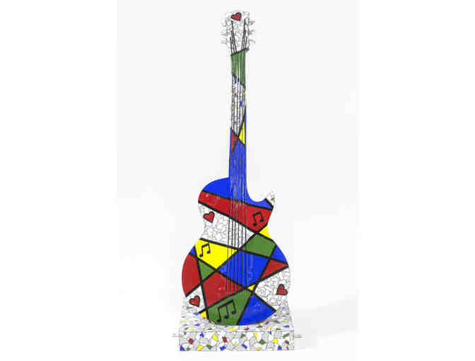 This 5-foot fiberglass electric guitar focuses on lines, shapes, vibrant colors, and the integration of an illusion of mosaic tile. Eddie Bruckner is inspired to create visual parallels of world impressions using these techniques. This illusion of mosaic tile provides cohesion to his body of work and serves to provide balance, repetition, movement, and other elements of strong artistic design & composition. Eddie thinks about the mosaic element as confetti, to further his goal of conveying fun, exhilaration, and happiness. The mosaic patterns add life and positive energy to his work. Eddie’s guitar is about having fun, bringing a smile to people’s faces, and at the same time, providing a unique way of experiencing some of our most familiar objects, places, or people.