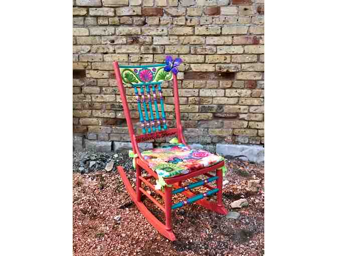 To create my chair, I repurposed an antique rocker and transformed it into a colorful garden by painting, sewing and I hand felted a butterfly to live in the garden! Have hope, life can get better “today caterpillars are tomorrow’s butterflies.!