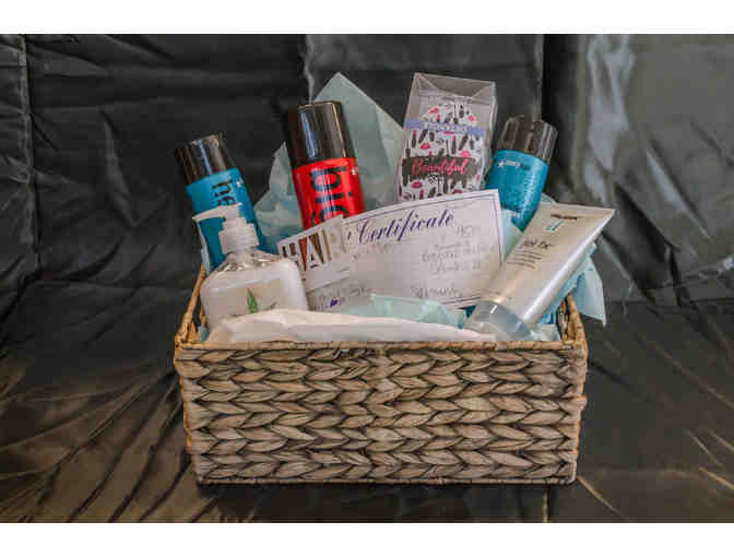 $45 Gift Certificate to Bombshell Hair disign and a basket containing: