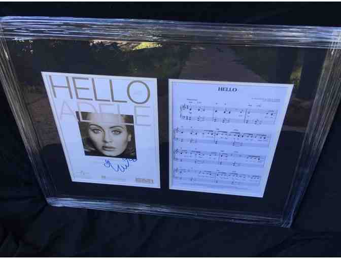 Hello, it's me! Own a piece of the Grammy Award winning song "Hello" by Adele. This piece is signed by Adele and include a photo in a cherry wood encasing.