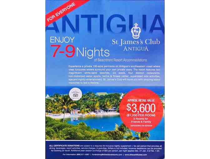Certificate provides 7 to 9 nights of Premium accommodation, for three (3) rooms double occupancy at the 4-Star Caribbean beachfront resort, St. James's Club & Villas in Antigua