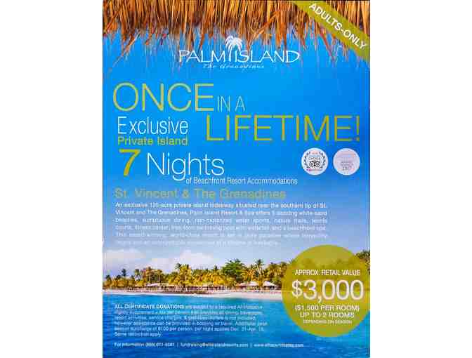 Certificate provides 7 nights of Exclusive Private Island accommodation for up to two (2) rooms, double occupancy, at the Adults-Only Caribbean beachfront resort, Palm Island Resort & Spa, The Grenadines