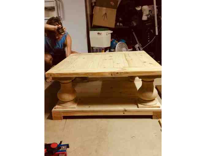 Prop your feet up on this hand crafted farmhouse style coffee table. Tucker Gregg, the master craftsman, began his company T.E.G. Enterprises in 2016 and has custom crafted table tops, wall clocks, headboards, cutting boards, pallet decor, and end tables, just to name a few. With its medium stain, this piece will look fabulous in most homes.