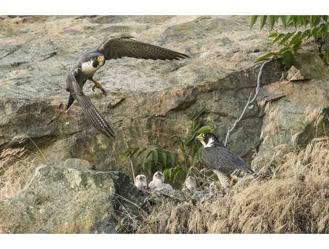 The male falcon just dropped off a meal for the female to feed the family and then flew off to hunt some more.