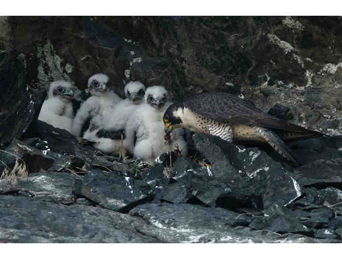 Four falcon chicks line up for food.