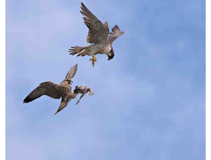 A juvenile Peregrine Falcon grabs prey mid-air, dropped by an adult.