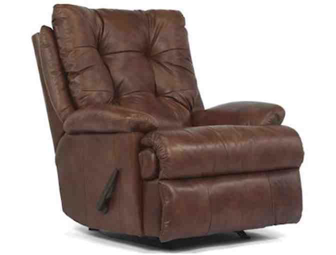 This is a 100% LEATHER rocking recliner from Flexsteel. It features pillow arms, a tufted back cushion and a blue ribbon steel seat spring system which delivers unmatched comfort and durability.
