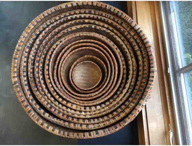 A collection of 12 woven nesting baskets ranging in size. The smallest bowl is 6'' in diameter by 2'' deep and the largest bowl is 23'' in diameter by 8'' deep. They are in good condition. Previously held yarn in display.