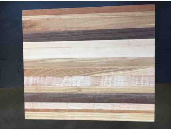 Local craftsman Jack Sheehan has donated this incredible cutting board measuring 13''x11''x1'' It is laminated Maple, Tiger Maple, Cherry and Fir.
