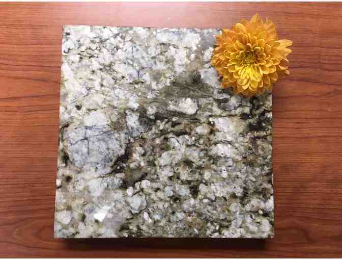 It measures 11” x 11” and is made with Golden Blue Persia granite from Brazil and hand crafted in Shelburne, Vermont.