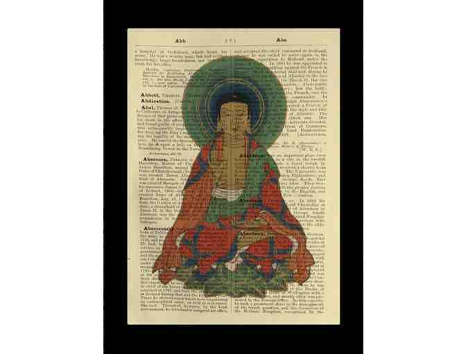 A tremendously unique rendering of a Buddha, the paper in this print Buddha Meditating on a Lotus Flower from FlamingPrints is an original 1800s dictionary page overprinted with the creator's artwork. The successful bidder will receive a framed version ready to hang.