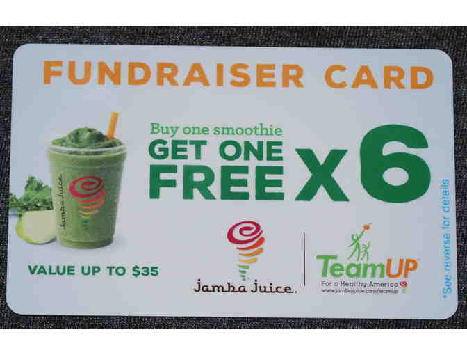 Jamba Juice fundraiser card contains 6 opportunities for you to purchase any smoothie and receive another of equal or lesser value for free at participating Jamba Juice stores. Some restrictions on locations apply (Theme parks, etc). Limit one BOGO per transaction.