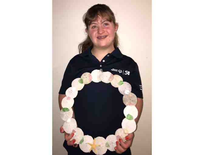 This is an original S.O.F.I.A Sand Dollar Wreath made by Special Olympic Rhode Island athlete Sofia Illiano. S.O.F.I.A stands for;