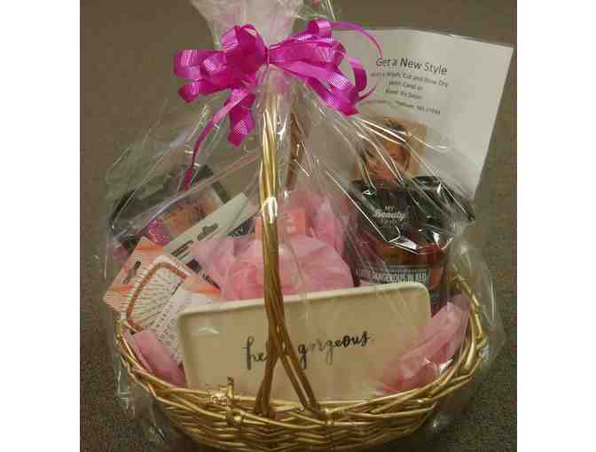 Basket filled with Copper Pro Brush, Nicole Miller Mascara, Nail Polishes, Facial Mask and Cute Tray with Hello Gorgeous!