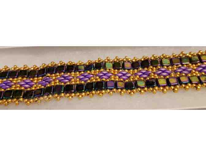 Iridescent Hand Beaded Bracelet made to accent any outfit with purple and turquoise accent with gold beads. Hand made by Abigail Pena of GLFHC.
