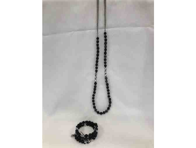 Stylish Black Beads with Silver Bead Accents on this long necklace and matching bracelet.