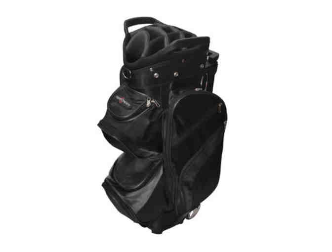 The RoadRunner golf cart bag offering many features found on other high-end cart bags with one big benefit most don’t have… the option of rolling your bag from the car to the course.