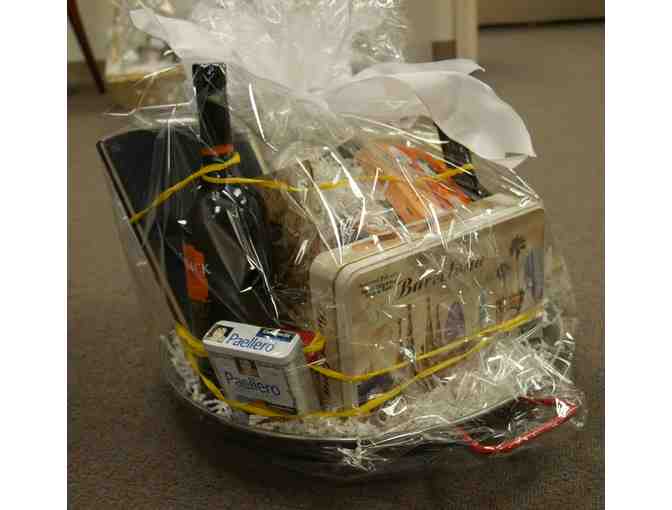 Cookbooks to make Paella along with Spanish Gourmet foods including Rice, Fig and Almond Cake, Drysack Wine, Gourmet Olive Oil, Barcelona Assorted Biscuits, Honey, Artichoke Hearts, Ceramic Dish for Serving and Giant Paella Pan.