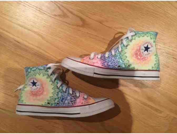 The shoes I have created have an original mandala design that I drew freehand. The outside design of the shoe is done in black and the inside of the shoe is a rainbow pattern. I was inspired to do this because I didn’t know who the person wearing them would be, so I wanted them to be somewhat subtle on the outside, with a bit more personality on the inside.