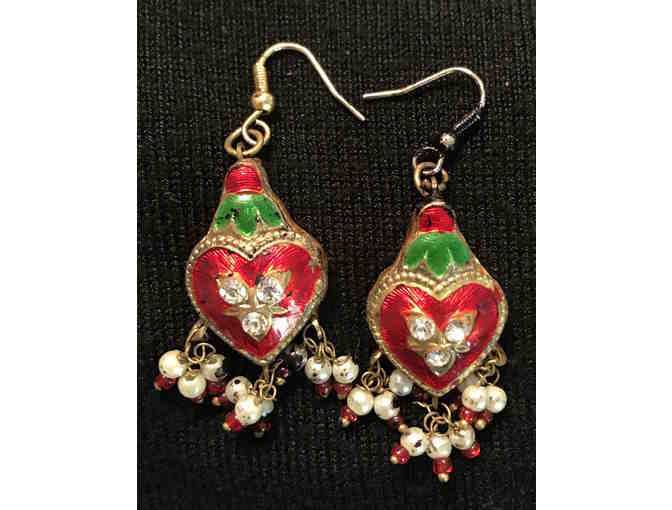 Incredibly lightweight and eye-catching heart-shaped earrings made in India, measuring roughly 1" in length. Colors: Red, white, green and gold. Studded with rhinestones at center.