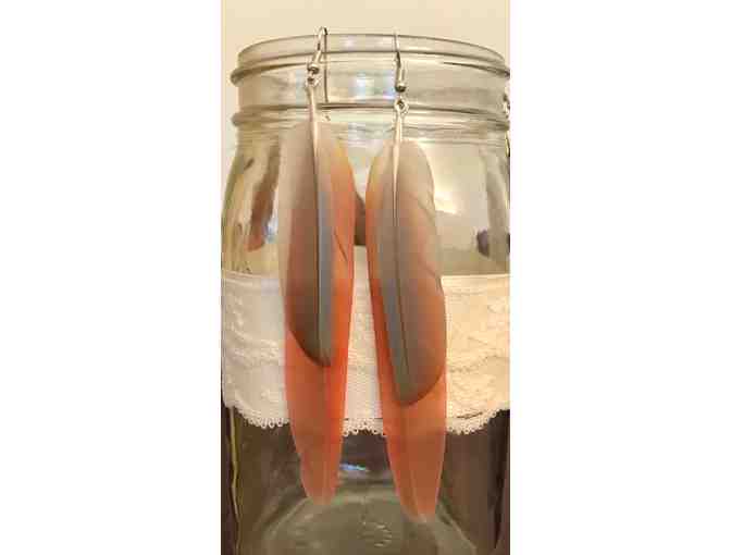 Pair of feather earrings in light red and light blue on silver fish-hook hangers. The longest feathers are 4.5” long with total length 5” including hangers.