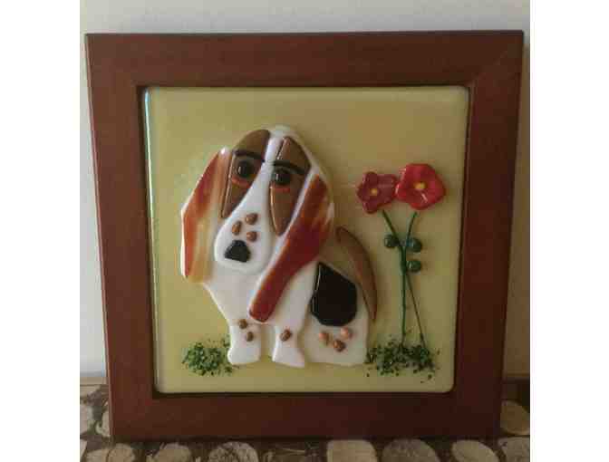 This one of a kind adorable basset hound is made of layers of glass that are fused together by firing in a kiln. The technique of tack-fusing maintains the individual characteristics, texture and depth of the layers.