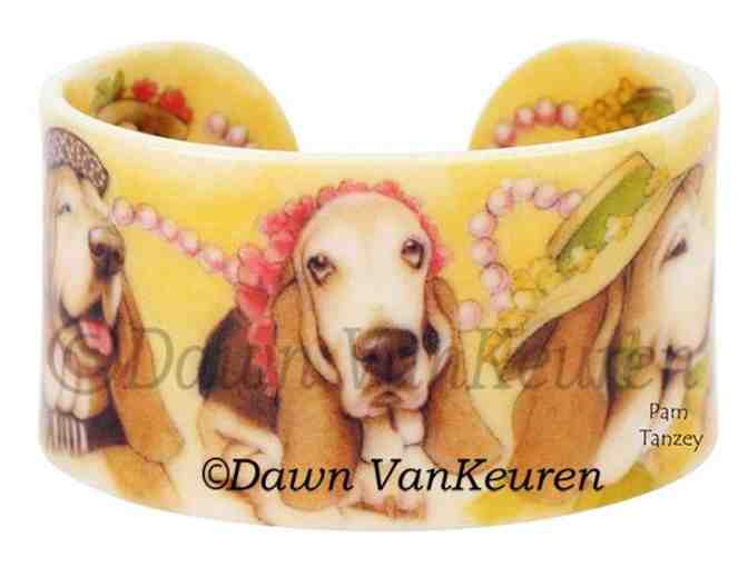 Plastic fashion cuff bracelet featuring Pawtunia, artwork by Pam Tanzey.