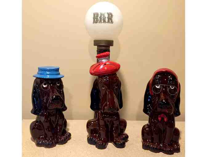 Set of 3 antique basset hounds. Each 7" basset is a bank! Basset with plug in light measures 13.5".