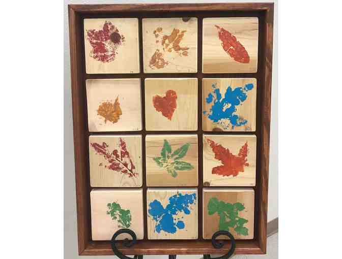 The 2nd Grade Class project is a framed leaf print measuring 18" x 23.5", inspired by their study of leaves. The finished project contains twelve 5" wooden blocks. Each student made and initialed their leaf print and these were combined to make a framed piece. The frame was also hand-made and finished. It is a lovely piece that proclaims the beauty and variety of our Lord's creation. Happy Fall Ya'll!