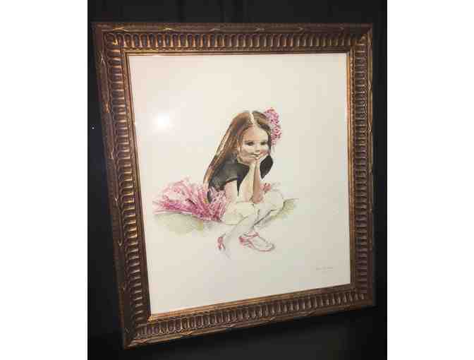 Local artist Ann Pearce specializes in watercolor images of children. Her notecard business, Annie Notes, displays her art on various notecards and invitations. This image entitled “Ballerina” is just one of many memorable pieces. A limited piece, the third of only six prints made, is beautifully framed. The completed size 18"x 16". A sweet expression of the beauty and creativity of young children.