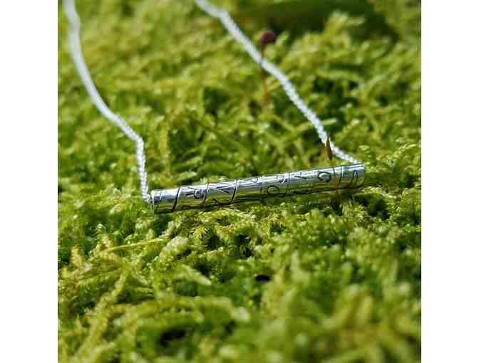 Each sterling silver wheel is individually handcrafted and approximately 1" long and is continuously stamped with a favorite phrase or mantra in a simple UPPERCASE font. Can you clearly read it from afar? Ah, it's a phrase meant for you to share as you wear it. It spins freely on it's chain