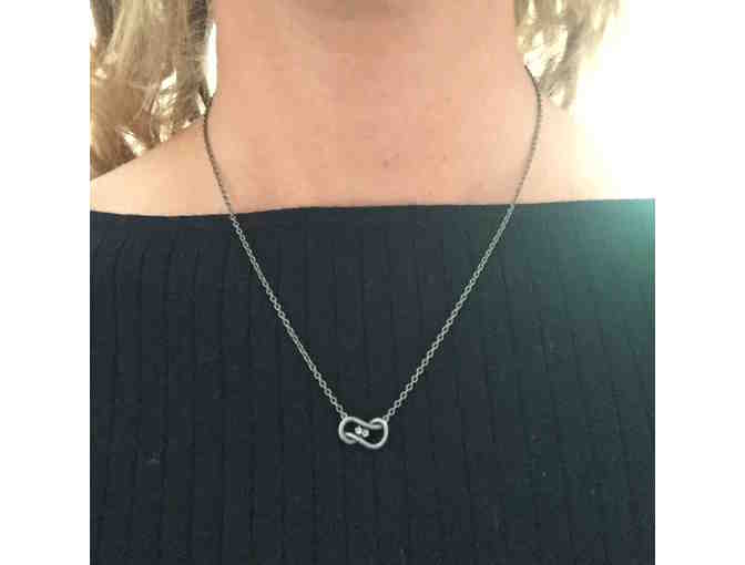 Pewter diamond necklace on 18" chain. Two little diamonds nestled in the center of an abstract design.