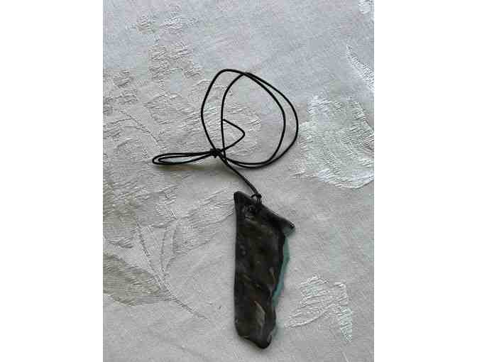 A lovely Fish Fin Pendant crafted in delicate ceramic measures 3 ½ X 1 ½ inches and hangs from a slender leather thong. The color, like any fish’s, changes in the light from dark olive to dark blue to dark gold, and will complement most of your wardrobe.