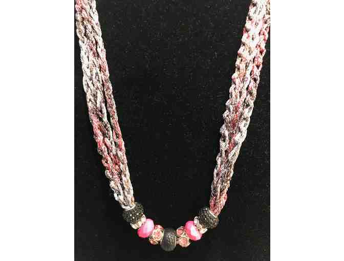 Length is adjustable from 10 to 16 inches long. Made of nylon jewelry yarn, pink, black and silver beads. A very special one of a kind necklace.