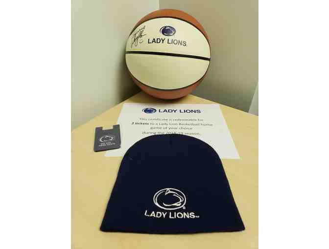 Catch a Lady Lions Basketball home game during the 2018-2019 season.  Bundle includes:  Basketball signed by Women's Head Coach Washington, 18x24 Poster, Certificate for 2 tickets to a game during the 2018-2019 season, Lady Lions knit hat, and a PSU cell phone adhesive credit card wallet.