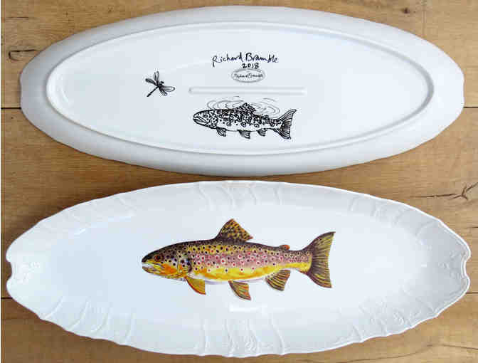 Trout Platter - designed by artist Richard Bramble of Sherborne, Dorset England, this ceramic piece came across the seas to us! Richard created this 25" brown trout platter for Casting for Recovery, drawing a fish, signing and dating on the back which makes it one of a kind. Use the platter to grace your home as a lovely serving piece or as a unique decoration displayed in your kitchen.