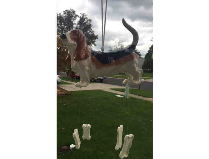 Ceramic basset hound measures 6" and has dangling ceramic bones.