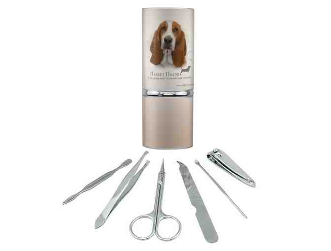 Stay fresh on the go with this conveniently compact beauty travel kit. The oval tube is made of metal for secure travel, and features a laminated wrap featuring the printed design shown. Inside, the kit contains several essential beauty tools, including a nail clipper, scissors, a metal file, tweezers, and a cuticle pusher, as well as an ear scraper. This beauty care kit will keep you in style on the road.