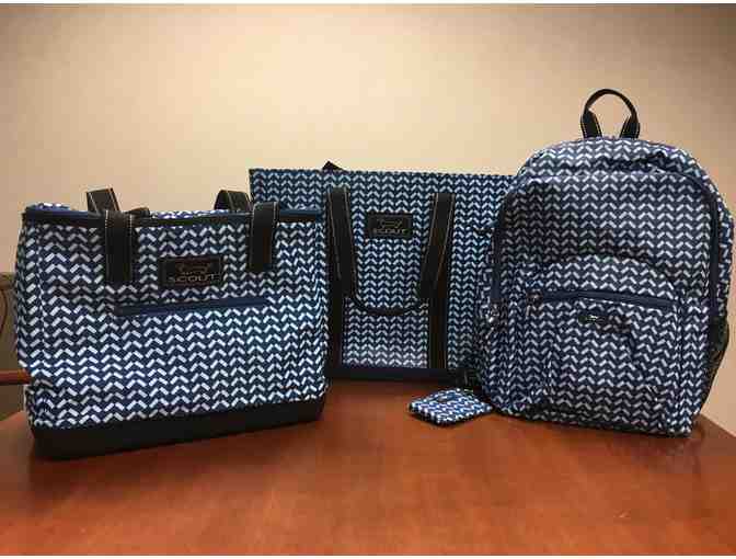 A collection of four dark and light blue SCOUT Travel bags, courtesy of Kathy Zachem.