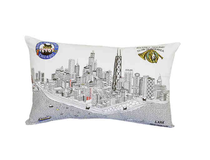 The highly detailed skyline view is stitched expertly into cotton canvas along with the 2018 Chicago Nationals logo and The Basset Hound Club of America logo. Also, the pillow features embroidered basset hounds throughout!