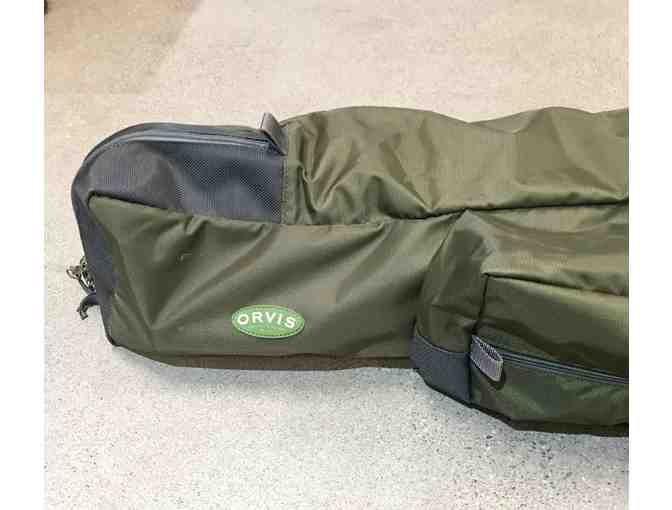 Orvis' Safe Passage Fishing Rod Bag is constructed from a new super-tough, water–repellent, light weight Velocity Nylon with ballistic trim. Bag has ample outer gear pockets for storage.