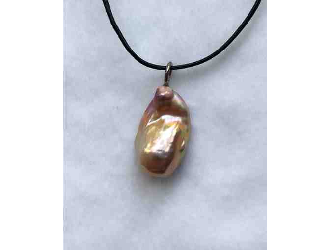High luster natural metallic color freshwater pearl necklace with a silver bale on a leather cord. The pearls is 16mm wide and 30mm long, leather cord is adjustable in length