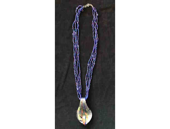 Curved Glass Pendant in irridescent shades of blue, silver, green, gold and brown on 3 17" strands of blue and purple seed beads.