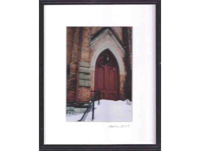 Signed photograph of door of historic First Presbyterian Church of Seneca Falls, where Alice Paul first proposed the ERA in 1923; Signed by photographer Madeleine Hansen, framed 9x11 color