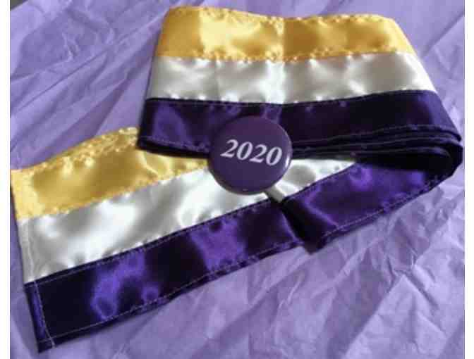 This is tri-colored sash, 72 inches long, 4 1/2 inches wide, crossed on a side with a 2020 pin to hold it together. This is handmade.